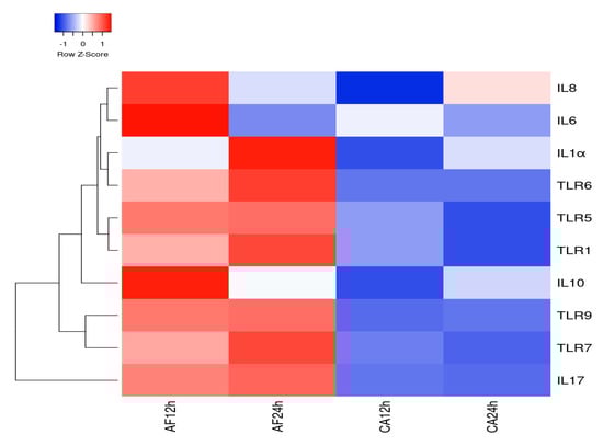 Gene expression heatmap constructed employing heatmapper.ca for 10 differentially expressed genes in human microglial cells challenged with A. flavus (AF) and C. albicans (CA) at 12 and 24 h p.i. The cluster value is coded with a range of colors from blue (for the lowest expression level) to red (for the highest expression level).