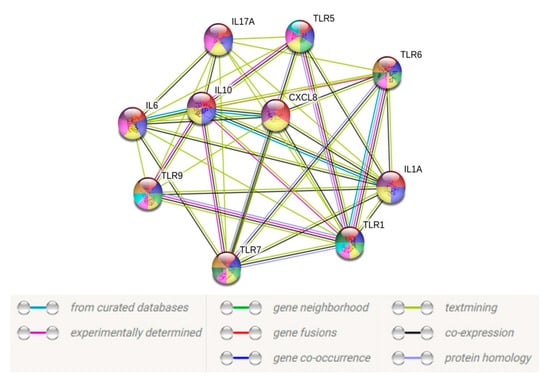 To unveil the functional facets associated with these TLRs and cytokines, we constructed a protein–protein interaction (PPI) network using the STRING database (https://string-db.org/) based on the transcript data obtained from the CHME-3 infection with A. flavus and C. albicans. Only 10 TLRs and/or cytokines with a fold change of >2-fold were utilized to construct the PPI network. By excluding the proteins without a quantified or differential expression, our resulting PPI network contained 10 nodes and 62 edges (Figure 7), with a p-value < 1.0 × 10−16, indicating a close interaction, while the PPI for CHME-3 infected with Candida sp. did not show any significant interaction due to less than five differentially expressed genes.