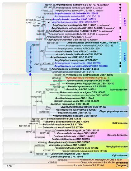 We follow LSU-ITS-RPB2-TUB2 to show the relationship among related taxa here (Figure 1). The best scoring RAxML tree with a final likelihood value of—1224.694904 is presented. The matrix had 1227 distinct alignment patterns, with 28.04% of undetermined characters or gaps. Estimated base frequencies were as follows; A = 0.247366, C = 0.234669, G = 0.265996, T = 0.251970; substitution rates AC = 1.117478, AG = 3.507552, AT = 1.477282, CG = 1.121674, CT = 6.681156, GT = 1.000000; gamma distribution shape parameter α = 0.485915. The ML, MP, and BY phylogenetic trees resulting from analyses of the alignment of LSU-ITS were different among taxa within the Amphisphaeriaceae (Figure S1). ML and BY results using LSU-ITS-RPB2-TUB2 combined matrix were similar in topologies, and Amphisphaeriaceae was comprised of two well-supported clades containing Amphisphaeria species (clade Y) and species that had previously been classified under the genus Lepteutypa (clade X). Amphisphaeria curvaticonidia (HKAS 102288, MFLUCC 18-0620) formed a basal lineage to all the other amphisphaeriaceous taxa in only MP analysis by using the LSU-ITS-RPB2-TUB2 combined matrix.