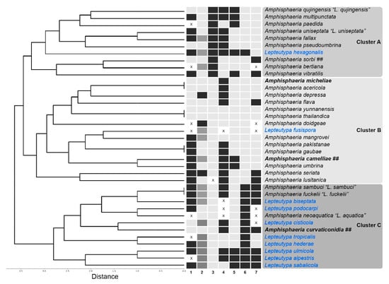 Cluster analysis dendrogram showing similarity among Amphisphaeria and Lepteutypa species (linkage algorithm paired group UPGMA; Average Distance measure). Characteristics: (1) nature of the clypeus; (2) nature of the ascomata; (3) l/w ratio of asci; (4) apical ring; (5) l/w ratio of ascospores; (6) ascospore septation; and (7) mucilaginous sheath around ascospores. “X” denotes missing data. Newly introduced species are in bold. Taxa which needed to be revised are in blue. Holomorphic taxa are denoted as “##”.