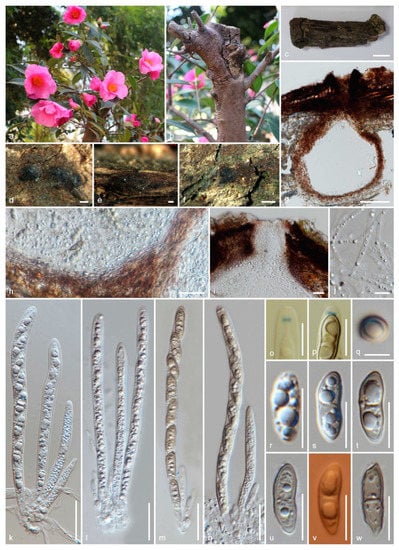 The sexual morph of Amphisphaeria camelliae (HKAS 107021, holotype). (a,b) Host Camellia japonica; (c) substrate; (d–f) ascomata on the substrate; (g) vertical section of ascoma; (h) peridium; (i) ostiole; (j) paraphyses; (k–n) asci; (o,p) apical ring bluing in Melzer’s reagent; (q) ascospore top view; (r–w) ascospores (v in Congo Red). Scale bars are set at (c) 1 cm; (f) 500 µm; (d,e) 200 µm; (g) 100 µm; (h,i,k–n) 20 µm; (o,p,r–w) 10 µm; (q) 5 µm.