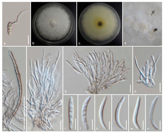 The asexual morph of Amphisphaeria camelliae (MFLUCC 20-0122, ex-type living culture). (a) Germinating ascospore; (b) upper view, (c) reverse view of the 2 weeks old colony on PDA; (d) conidiomata in the culture; (e) setae; (f–h) conidiophores, conidiogenous cells and conidiogenesis; (i–n) conidia. Scale bars are set at (e) 50 µm; (a,f–h) 10 µm; (i–n) 5 µm.