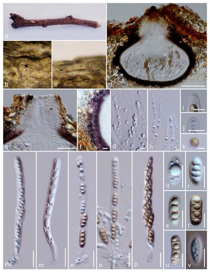 - Jaklitsch, W.M.; Gardiennet, A.; Voglmayr, H. Resolution of morphology-based taxonomic delusions: Acrocordiella, Basiseptospora, Blogiascospora, Clypeosphaeria, Hymenopleella, Lepteutypa, Pseudapiospora, Requienella, Seiridium and Strickeria. Persoonia 2016, 37, 82–105. [Google Scholar] [CrossRef]