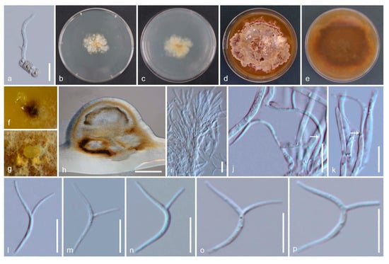 - Crous, P.W.; Wingfield, M.J.; Guarro, J.; Hernández-Restrepo, M.; Sutton, D.A.; Acharya, K.; Barber, P.A.; Boekhout, T.; Dimitrov, R.A.; Dueñas, M.; et al. Fungal Planet description sheets: 320–370. Persoonia 2015, 34, 167–266. [Google Scholar] [CrossRef]