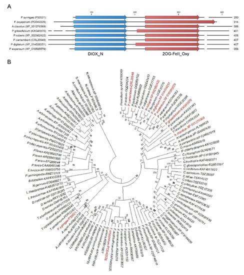 Protein domains and phylogenetic tree of the ethylene-forming enzymes (EFE) proteins from filamentous fungi. (A) A multiple protein sequence alignment of the seven selected fungal EFE proteins, plus that from bacterium P. syringae, was performed with MUSCLE. The non-haem dioxygenase in morphine synthesis N-terminal (PF14226.7) and the 2OG-Fe (II) oxygenase superfamily (PF03171.21) domains are represented as blue and red arrows, respectively. (B) Multiple protein sequence alignments were performed with the MUSCLE algorithm from MEGA X. The phylogeny tree of the EFE proteins of filamentous fungi was inferred by the maximum likelihood method and the Jones-Taylor-Thornton (JTT) matrix-based model. The bootstrap consensus tree inferred from 1000 replicates is taken to represent the evolutionary history of the analyzed taxa. This analysis involved 105 protein sequences, with a total of 1215 positions in the final dataset. Evolutionary analyses were conducted in MEGA X. The fungi used for the multiple sequence alignment in (A) are indicated in red. Supplementary Table S3 includes further details of all the sequences employed in this analysis.