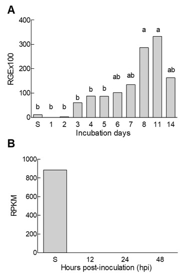 Gene expression analysis of the P. digitatum efeA gene. (A) Relative gene expression (RGE) of the efeA gene (PDIP_08660) during growth on potato dextrose agar (PDA) medium. The spore suspension (5 µL of 105 conidia/mL) was inoculated on the center of PDA plates and incubated for up to 14 days at 24 °C in the dark. Expression levels are relative to the β-tubulin reference gene. Values are the mean of at least three biological replicates. Different letters indicate significant differences among samples according to Tukey’s test with a p-value of 0.05. (B) Reads per kilobase of exon model per million mapped reads (RPKM) values from RNA-seq during orange fruit infection by P. digitatum using the Roche 454 GS FLX Titanium system [28]. Samples analyzed: P. digitatum spores collected after 7 days of growth in PDA (S), and P. digitatum-infected oranges at 12, 24, and 48 h post inoculation (hpi).