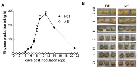 (A) Ethylene production during the growth of parental strain Pd1 (●) and the Δ1f knockout mutant (○) on inactivated orange peel discs. Orange peel discs were inoculated with a conidia suspension (106 conidia/mL) of both strains in 15 mL glass tubes at 24 °C for up to 21 days post inoculation (dpi). Values are the mean of five biological replicates ± SEM. The ethylene production values are included in Table S5. (B) Images show the development of parental strain Pd1 and the Δ1f knockout mutant on the orange peel discs incubated at 24 °C up to 21 dpi.