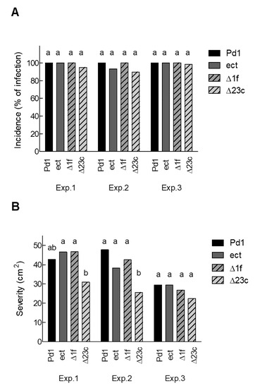 (A) Incidence (measured as the percentage of infected wounds) and (B) severity (measured as the macerated area in cm2) in the oranges infected with the parental P. digitatum Pd1 strain, the ectopic mutant, or the two knockout mutants in three independent experiments. Experiments 1 and 2 were carried out at the beginning of harvest, while experiment 3 was performed at the end of harvest. Oranges were inoculated with 10 µL of a spore suspension (104 conidia/mL) of the different strains. Fruit were incubated at 20 °C and 90% relative humidity for up to 7 days. There were three replicates of five fruit and four wounds per fruit. Bars show the mean values of both incidence and severity 7 d post inoculation. The bars labeled with the same letter in each experiment do not differ at the 95% confidence level based on Tukey’s honest significant difference (HSD) procedure.
