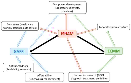 International Society for Human and Animal Mycology (ISHAM)’s close coordination with European Confederation of Medical Myology (ECMM) and Global Action Fund for Fungal Infections (GAFFI). Arrows indicate the activities and influence of different organizations in the indicated fields. Black arrows indicate close coordination of the three organizations.