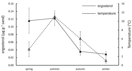 Seasonality of mycelial production and temperature in coniferous forest soil. The results indicate the mean (±SE) content of ergosterol in sandbags after incubation in situ for three months and mean (±SE) daily temperature in each season.
