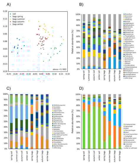 The composition of the fungal community in the studied soil did not show significant differences among the seasons, while the composition of the fungal communities in the sandbags was strongly seasonal (PERMANOVA on Bray-Curtis dissimilarities, p < 0.001). Furthermore, the fungal communities in the sandbags were also significantly different from those in the soil (Figure 2A). In general, the sandbag communities were dominated in all seasons by fungi belonging to Ascomycota (63–79%), while the soil communities were dominated by Basidiomycota (58–64%, Figure 2B,C). The sandbag communities also had significantly higher proportions of sequences of Mucoromycota (from 3.7% in the summer to 9.9% in autumn) compared to soil (1.2–1.7%, Figure 2C). While the soil communities were dominated by Tylospora (15–17%), Piloderma (8–15%), Russula (7–14%) and Elaphomomyces (6–14%) species, the sandbag communities were dominated by Penicillium (1.5–21%), Xerocomus (0.6–16%) and Oidiodendron (1.5–14%) species, with many taxa dominant in the soil virtually missing in the sandbags (Figure 2B). This was, for example, the case of the ectomycorrhizal fungi Tylospora fibrillosa, Piloderma sp. and Russula ochroleuca.