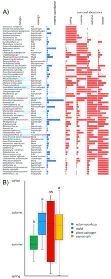 Whatever imperfect may be the representation of the total fungal community in the sandbags, their use allows to assess the seasonality of mycelial production across those taxa that colonise them. In this respect, our results show that the seasonal variation in mycelial growth is widespread among fungi, since more than 80% of dominant fungi, belonging to a wide range of ecological guilds, show preferential sandbag colonisation in certain seasons (Figure 3A). In a previous study, we demonstrated seasonal differences in the gene transcription of soil bacteria from the same ecosystem and shown that their growth varies across seasons. While the opportunistic bacteria, in contrast to decomposers of complex biopolymers, were found to proliferate rapidly in the summer when rhizodeposition is high and reduce their growth in the winter, the decomposers grew at similar rates in both seasons [33]. In analogy, we would expect the share of the mycelial production of similar opportunistic fungi—moulds and ECM fungi that obtain carbon from their hosts—to increase in sandbags in the vegetation season, while other saprotrophs are more likely to be represented in the winter. Our results indeed show that sandbag colonisation by ECM is higher in the spring and summer and low in the autumn and winter (Figure 2D). We also demonstrate that ECM fungi grow during the whole year, irrespective of the activity of their hosts. However, if we consider the ergosterol content as a proxy of the biomass and the relative abundance of sequences as the representation of ECM in the fungal community, the sandbag colonisation in the spring and summer might account for some 0.0160–0.0300 µg ergosterol g−1 sand and only 0.0007 and 0.0015 µg g−1 sand in the autumn and winter, respectively, i.e., with an approximate mycelial production of 2–5% of peak productivity in the summer. It is unclear why the share of ECM is lowest in the autumn when temperatures are still favourable for tree photosynthetic production and Picea abies root tip production is similar as in the spring [66].