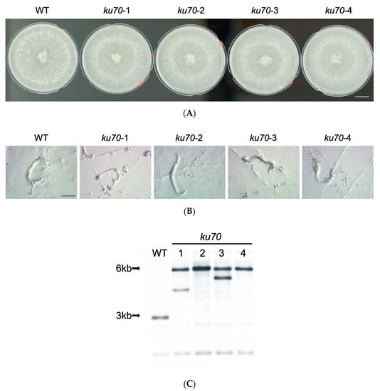 - Choquer, M.; Robin, G.; Le Pêcheur, P.; Giraud, C.; Levis, C.; Viaud, M. Ku70 or Ku80 deficiencies in the fungus Botrytis cinerea facilitate targeting of genes that are hard to knock out in a wild-type context. FEMS Microbiol. Lett. 2008, 289, 225–232. [Google Scholar] [CrossRef]