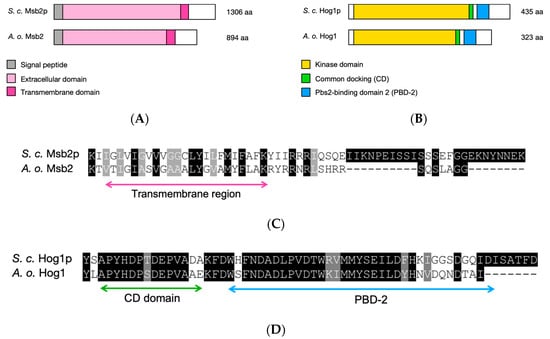 A. oligospora Msb2 and Hog1 are structural orthologs of the S. cerevisiae Msb2p and Hog1p. (A) Schematic representation of the domain structure of A. oligospora and S. cerevisiae Msb2 proteins. Both proteins share common features of signaling mucins, including a N-terminal signal peptide, a large extracellular domain, and one transmembrane that is closed to the C-terminus. (B) Schematic representation of the domain structure of A. oligospora and S. cerevisiae Hog1 proteins. Both proteins share common features, including a protein kinase domain, common docking (CD) domain and Pbs2-domain binding 2 (PBD-2). (C) Amino acid sequence alignment of the transmembrane region of the S. cerevisiae Msb2 (S. c. Msb2p) and A. oligospora Msb2. (D) Amino acid sequence alignment of the CD domain and PBD-2 of the S. cerevisiae Hog1 (S. c. Hog1p) and A. oligospora Hog1. Highly conserved residues are shaded in black; moderately conserved residues are shaded in gray.