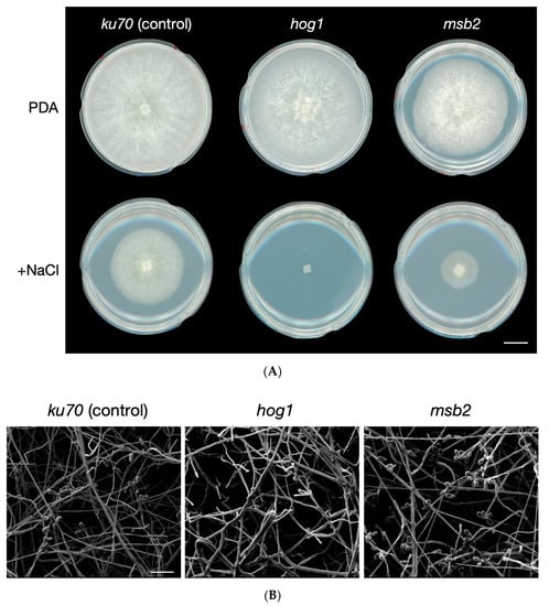Defects of the hog1 and msb2 mutants in response to hyperosmotic stress. (A) Colonies of ku70 (control), hog1, and msb2 mutants grown on PDA plates (5-cm diameter) for 4 days with or without 1% (w/v) NaCl (Scale bar, 1 cm). (B) SEM images of ku70 (control), hog1, and msb2 mutants after growing on PDA plates (5-cm diameter) for 4 days (Scale bar, 50 μm).