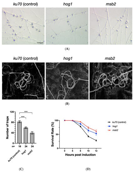 Both the hog1 and the msb2 mutants were capable of forming traps upon exposure to C. elegans, but in both cases, trap numbers were reduced. Notably, the hog1 mutant displayed a defect in developing proper three-dimensional trap structures, although those of the msb2 mutant were comparable to ku70 control traps. These observations potentially explain the decreased nematocidal activity of our mutants, as assessed by C. elegans survival.