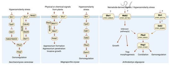 Schematic models for the role of Hog1 and Msb2 in yeast and filamentous fungi. S. cerevisiae Sln1, Sho1, and Msb2 sense the changes in the osmolarity of the extracellular environment and activate Hog1 for osmoregulation. The proteins separated by a slash symbol (/) are functionally redundant. Not all of the known components are shown. In blast fungus, M. oryzae, Msb2 and Sho1 are involved in recognizing physical or chemical signals from plant to activate the downstream Mst11-Mst7-Pmk1 MAPK cascade which is responsible for pathogenesis. The Ssk2-Pbs2-Osm1 MAPK cascade is activated by Sln1 to respond to changes in the osmolarity of the extracellular environment. In A. oligospora, both Hog1 and Msb2 are not only involved in osmoadaptation but also in growth, trap morphogenesis and conidiation. Solid and dashed arrows indicate the verified and putative connections, respectively. The figure was created with BioRender.com.