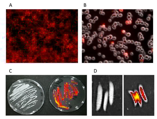- Vande Velde, G.; Kucharikova, S.; Schrevens, S.; Himmelreich, U.; Van Dijck, P. Towards non-invasive monitoring of pathogen-host interactions during Candida albicans biofilm formation using in vivo bioluminescence. Cell. Microbiol. 2014, 16, 115–130. [Google Scholar] [CrossRef]