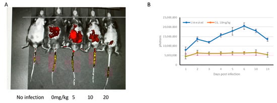 - Avci, P.; Karimi, M.; Sadasivam, M.; Antunes-Melo, W.C.; Carrasco, E.; Hamblin, M.R. In-vivo monitoring of infectious diseases in living animals using bioluminescence imaging. Virulence 2018, 9, 28–63. [Google Scholar] [CrossRef] [PubMed]