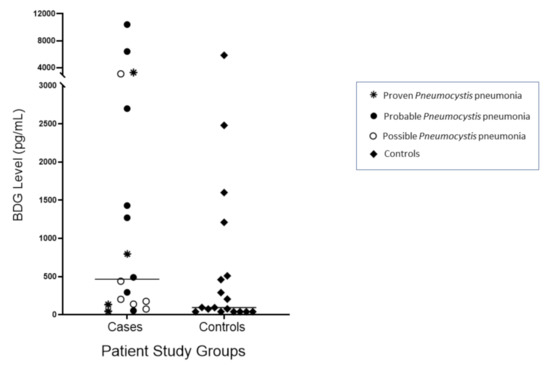 Patients who had a positive BALF PCR for P. jirovecii and who were diagnosed with proven, probable, or possible Pneumocystis pneumonia were included in the study; they were matched 1:1 by age within 5 years and by risk factors with control patients who did not have Pneumocystis pneumonia. BDG results were not included in this categorization. Patients with a positive BALF PCR who did not meet criteria for proven, probable, or possible Pneumocystis pneumonia were excluded from further analysis.