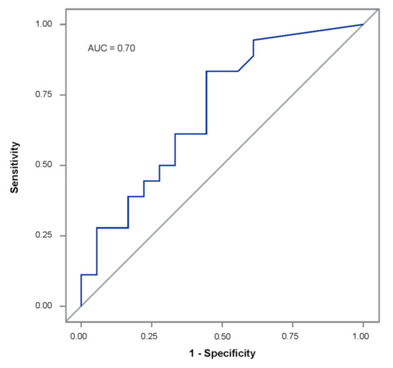 Pneumocystis pneumonia cases and their controls were analyzed, ROC/AUC analysis showed that the optimal cut-off value for BALF BDG was 290 pg/mL, giving a sensitivity of 75%, specificity of 58%, PPV of 64%, and NPV of 70%; the AUC was 0.70 (95% CI 0.48–0.91).
