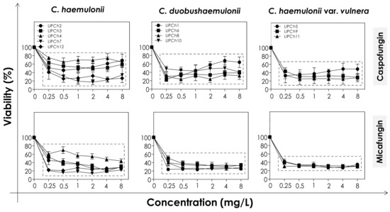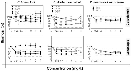 The decrease of both viability and biomass parameters by caspofungin was isolate-dependent. At the lowest concentration used (0.25 mg/L) this echinocandin caused a statistically significant reduction in the viability of all of the fungal cells tested (p < 0.05; One-way ANOVA analysis of variance, Dunnett’s multiple comparison test), varying from 30–80% among the different isolates (Figure 1). However, caspofungin was unable to reduce the biomass of some of the C. haemulonii isolates (LIPCh2, LIPCh3 and LIPCh4) even at the highest concentration used. Nevertheless, for the remaining fungal isolates the drug caused a biomass reduction of up to 60% (mainly against the C. duobushaemulonii isolates) (Figure 2). The isolates LIPCh2 (C. haemulonii), LIPCh1 (C. duobushaemulonii) and LIPCh5 (C. haemulonii var. vulnera) were less susceptible to caspofungin at the higher concentrations (Figure 1).