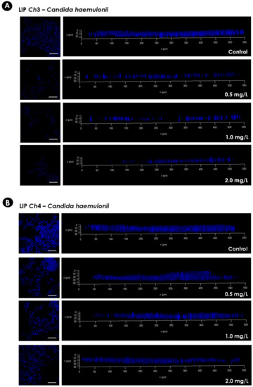 Representative confocal laser scanning microscopy (CLSM) images of the biofilms formed by C. haemulonii on a polystyrene surface. Yeasts (200 μL containing 106 cells) were placed to interact with the polystyrene for 48 h at 37 °C. Subsequently, the supernatant fluids were removed and washed with PBS, and 200 µL of RPMI 1640 medium containing different concentrations of micafungin were added. The biofilms were incubated at 37 °C for an additional 48 h. Afterwards, the supernatant fluids were carefully removed again, and the wells were washed twice with PBS to remove non-adherent cells. Finally, the biofilms were stained with Calcofluor white in order to evidence the fungal biomass. The panels on the left represent the top view images of the fungal biofilms visualized by Confocal Laser Scanning Microscopy (CLSM) (bars represent 5 µm). The graphs on the right represent the three-dimensional reconstruction of the biofilms formed. The isolate LIPCh3 of C. haemulonii (A) was chosen to represent susceptible biofilms, while the isolate LIPCh4 of C. haemulonii (B) represents resistant biofilms.