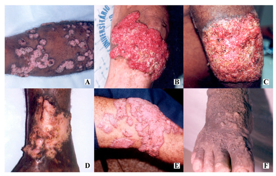 - Silva, C.M.P.; Silva, A.C.M.; Marques, C.M.; Saldanha, A.C.R.; Nascimento, J.D.L.; Branco, M.R.F.C.; Silva, R.R.; Costa, J.M. Chromoblastomycosis associated with leprosy: Report of 2 cases. Rev. Soc. Bras. Med. Trop. 1994, 27, 241–244. [Google Scholar] [CrossRef]