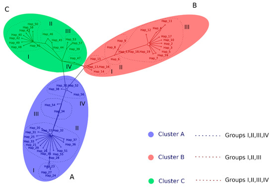 Internal Transcribed Spacer (ITS) haplotype network obtained from dataset of 185 sequences of Fonsecaea spp. and the 59 haplotypes generated. Cluster A—F. pedrosoi: shared in 4 groups (Group I: Hp23,24,27 obtained from Brazil; Group II: Hp20–22,25,26,28,29,31–33,35–37,51,55 obtained from Brazil, Argentina, Uruguay, Venezuela, Mexico and Lybia; Group III: Hp34,54 obtained from Puerto Rico; Group IV: Hp30,38,52,56 obtained from Brazil and Venezuela); Cluster B—F. monophora: shared in 3 groups (Group I: Hp13-16 obtained from China and Malaysia; Group II: Hp6,8,9 obtained from China, India and Guinea; Group III: Hp1–5,7,10–12,17–19,59 obtained from Brazil, China, USA, Cuba, Poland); Cluster C—F. nubica: shared in 4 groups (Group I: Hp40–43,48–50 obtained from China; Group II: Hp44–46 obtained from China, Suriname, Camaroon; Group III:39,53,57 obtained from Brazil; Group IV: Hp47 obtained from China).
