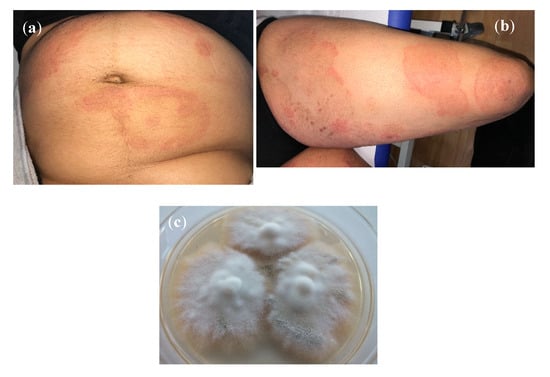 - Süß, A.; Uhrlaß, S.; Verma, S.B.; Ludes, A.; Monod, M.; Krüger, C.; Nenoff, P. Extensive tinea corporis due to a terbinafine resistant Trichophyton mentagrophytes isolate of the ‘Indian genotype’ in a young infant from Bahrain in Germany. Hautarzt 2019, 70, 888–896. [Google Scholar] [CrossRef]