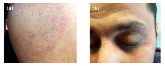 - Verma, S.; Vasani, R.; Gupta, S. Involvement of little discussed anatomical locations in superficial dermatophytosis sundry observations and musings. Indian Dermatol. Online J. 2020, 11, 419–424. [Google Scholar] [CrossRef]