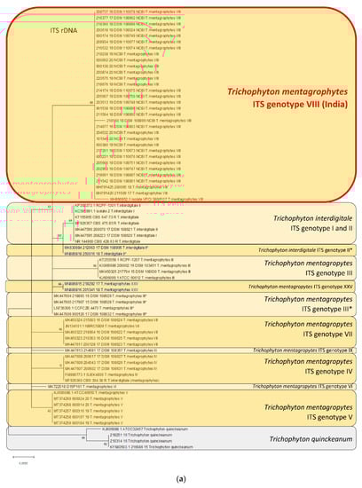 - Nenoff, P.; Verma, S.B.; Uhrlaß, S.; Burmester, A.; Gräser, Y. A clarion call for preventing taxonomical errors of dermatophytes using the example of the novel Trichophyton mentagrophytes genotype VIII uniformly isolated in the Indian epidemic of superficial dermatophytosis. Mycoses 2019, 62, 6–10. [Google Scholar] [CrossRef]