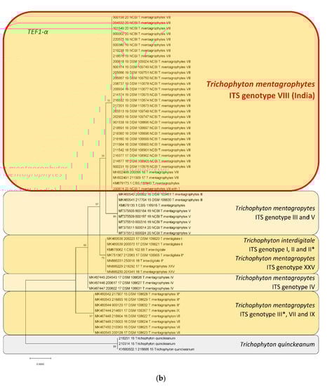 Phylogenetic analysis of the dermatophyte isolates based on the ITS regions of rDNA and the TEF1-α gene (Table 2).The evolutionary history was inferred by using the maximum likelihood method and Tamura-Nei model [10]. The tree with the highest log likelihood (−907.70) is shown. The percentage of trees in which the associated taxa clustered together is shown next to the branches. Initial tree(s) for the heuristic search were obtained automatically by applying Neighbor-Join and BioNJ algorithms to a matrix of pairwise distances estimated using the maximum composite likelihood (MCL) approach, and then selecting the topology with superior log likelihood value. The tree is drawn to scale, with branch lengths measured in the number of substitutions per site. This analysis involved 28 nucleotide sequences. Codon positions included were 1st + 2nd + 3rd + noncoding. There were a total of 1086 positions in the final dataset. Evolutionary analyses were conducted in MEGA X [11]. (a) Phylogenetic tree of T. mentagrophytes based on sequencing of the ITS regions of rDNA genes. By sequencing, a 100% concordance with NCBI reference strains (accession numbers MH791420, MH791425, MH990852) was found for all 29 isolates. All these isolates formed their own cluster, which is now called the ITS genotype VIII (India) of T. mentagrophytes. These isolates (T. mentagrophytes Type VIII or clade) were clearly discriminated from already known T. mentagrophytes genotypes, e.g., II, V, VII. Rooted with Trichophyton quinckeanum. (b) Phylogenetic tree of T. mentagrophytes based on sequencing of the TEF1-α gene. Used NCBI reference sequences (TEF1-α gene) were MH802491 and MH802496 (accession numbers). Within the phylogenetic tree, all T. mentagrophytes ITS Type VIII strains from Germany formed their own clade, which is clearly discriminated from the other, above mentioned, T. mentagrophytes genotypes. Rooted with T. quinckeanum.
