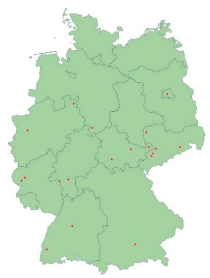 Numerous reports and findings from our own laboratory suggest that the frequently terbinafine-resistant dermatophyte T. mentagrophytes Type VIII is becoming increasingly prevalent in countries other than Germany and beyond. T. mentagrophytes Type VIII has been isolated from skin scrapings of patients in Iraq, Switzerland, Cambodia, Finland, Estonia and Poland [32,33]. We have isolated only individual strains of T. mentagrophytes Type VIII since 2016, albeit initially under a different name of the species, owing to the classification at that time. There has been a significant increase in the frequency of detecting T. mentagrophytes Type VIII in the past two years in Germany and we regularly see a strain of T. mentagrophytes type VIII in routine diagnostics about every two to three weeks, which appears significant. The isolates of T. mentagrophytes Type VIII originate from all over Germany. Patients with dermatophytoses, due to the Indian genotype of T. mentagrophytes, have been identified in large cities like Berlin, Munich and Leipzig, as well as small towns and rural areas of Germany (Figure 6).