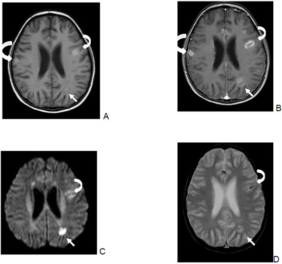 - Gupta, K.; Banerjee, A.; Saggar, K.; Ahluwalia, A.; Saggar, K. A prospective study of magnetic resonance imaging patterns of central nervous system infections in pediatric age group and young adults and their clinico-biochemical correlation. J. Pediatr. Neurosci. 2016, 11, 46–51. [Google Scholar] [CrossRef] [PubMed]
