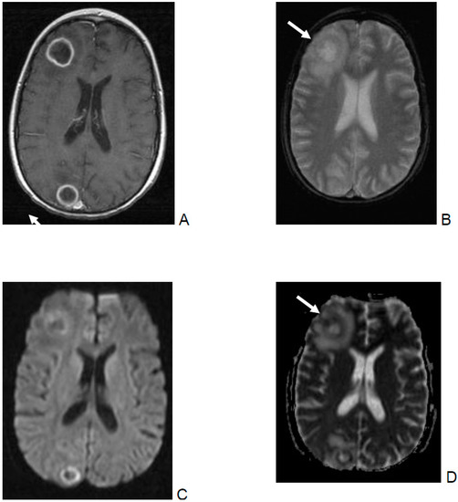 - Luthra, G.; Parihar, A.; Nath, K.; Jaiswal, S.; Prasad, K.; Husain, N.; Husain, M.; Singh, S.; Behari, S.; Gupta, R. Comparative Evaluation of Fungal, Tubercular, and Pyogenic Brain Abscesses with Conventional and Diffusion MR Imaging and Proton MR Spectroscopy. Am. J. Neuroradiol. 2007, 28, 1332–1338. [Google Scholar] [CrossRef]