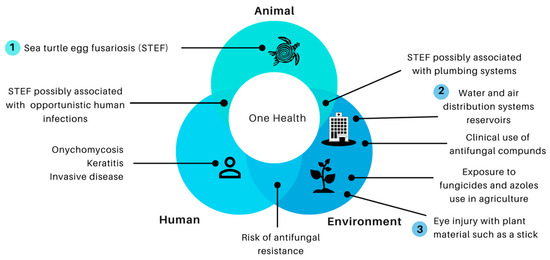 The emphasis of the One Health approach may explain common intersecting points, such as STEF disease, and plumbing human contaminations, hospital water, and air distribution systems are reservoirs for the fungi. Other risks of human infection come from environmental sources, for example, keratitis may develop following the traumatic inoculation with Fusarium-contaminated soil or plant material (Figure 1).