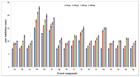 | 5e | 13 ± 0.1 | 16 ± 0.1 | 18 ± 0.3 | 20 ± 0.5 | 34.36 ± 0.6 | 68.72 ± 0.8 |