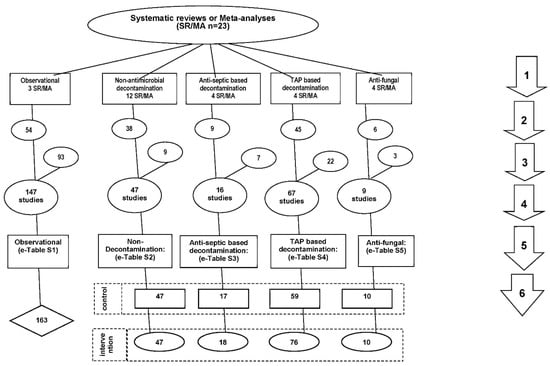The literature search and study decant used here is as in Figure 1. Twenty-three systematic reviews and meta-analyses were used as the starting point as these provided evidence base of the interventions of interest [,,,,,,,,,,,,,,,,,,,,,,]. A snowballing search strategy [] using the “Related articles” function within Google Scholar was undertaken for additional studies not identified within key systematic reviews. The key inclusion and exclusion criteria described previously [], being a patient group requiring prolonged (>24 h) ICU stay with group-level data for any of Pseudomonas or Acinetobacter infection data available, was expanded to include Candida infection data and studies of single anti-fungal prophylaxis [,]. All eligible studies were then collated, and any duplicate studies were removed.