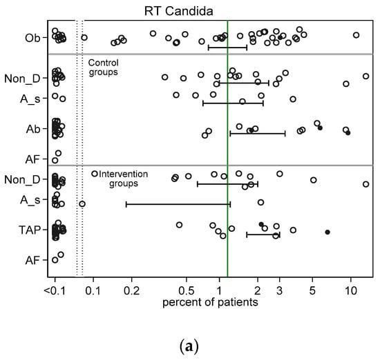 The approach here is to circumvent these obstacles by using, as a natural experiment, data from > 400 patient groups from > 250 studies of infection prevention interventions among ICU patients. The various groups of these studies have been exposed to infection prevention interventions which, in conjunction with other exposures, modify the patient microbiome. Of note, any one group here could experience multiple concurrent exposures such as concomitant CRF, TAP, PPAP, anti-fungal and ICU-LOS > 10 days. This is reflected in the wide range in incidences of infections across the >400 groups. Moreover, membership of a concurrent control group within a study of TAP is associated with significant one percentage point higher incidences of both candidemia [] and also Candida as a respiratory tract isolate [] in comparison to comparable patient groups in the literature.