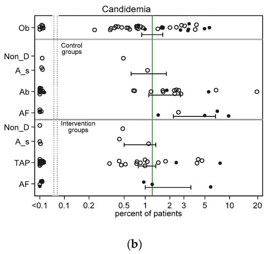 Scatter plots (logit scale) and 95% CI of RT Candida incidence (a) and Candidemia (b) in component (control and intervention) groups of various methods of infection prevention in the ICU, excluding studies with ICU-LOS < 5 days (ESM Figure S2a,b show including studies with ICU-LOS < 5 days). The benchmark incidence in each plot is the summary mean derived from the observation studies (central vertical line). The groups wide presence of candidemia risk factors (CRF) is identified by solid symbols versus not (open). Abbreviations; Ob = observational; non-D is non-decontamination; A_s is anti-septic; Ab is antibiotic control group; TAP is topical antibiotic prophylaxis and AF is anti-fungal.