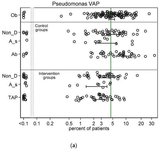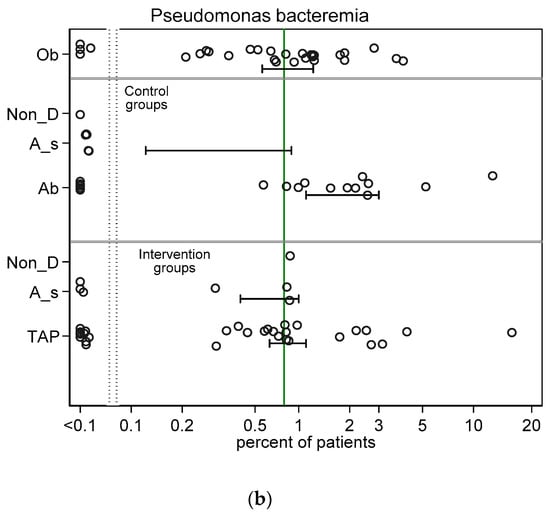 Scatter plots (logit scale) and 95% CI of Pseudomonas VAP incidence (a) and Pseudomonas bacteraemia (b) in component (control and intervention) groups of various methods of infection prevention in the ICU, excluding studies with ICU-LOS < 5 days (ESM Figure S3a,b show including studies with ICU-LOS < 5 days). The benchmark incidence in each plot is the summary mean derived from the observation studies (central vertical line). Abbreviations; Ob = observational; non-D is non-decontamination, A_s is anti-septic; Ab is antibiotic control group; TAP is topical antibiotic prophylaxis.