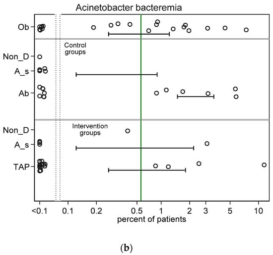 Scatter plots (logit scale) and 95% CI of Acinetobacter VAP incidence (a) and Acinetobacter bacteraemia (b) in component (control and intervention) groups of various methods of infection prevention in the ICU, excluding studies with ICU-LOS < 5 days (ESM Figure S4a,b show including studies with ICU-LOS < 5 days). The benchmark incidence in each plot is the summary mean derived from the observation studies (central vertical line). Abbreviations; Ob = observational; non-D is non-decontamination; A_s is anti-septic; Ab is antibiotic control group; TAP is topical antibiotic prophylaxis.