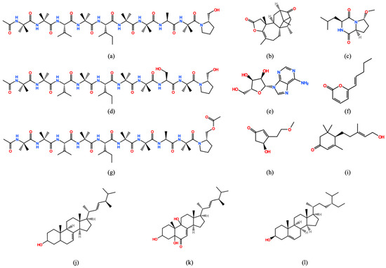 Chemical structure of the nonvolatile compounds (nVOCs) identified in the Trichoderma asperellum (IMI 393899) and Trichoderma atroviride (TS) EtOAc extracts. (a) aspereline A; (b) trichodermaerin; (c) methylcordysinin a; (d) aspereline E; (e) adenine nucleoside; (f) 6-pent-1-enyl-pyran-2-one; (g) aspereline H; (h) atrichodermone B; (i) atrichodermone C; (j) ergosta-7,22-dien-3-ol; (k) 3,5,9-trihydroxyergosta-7,22-dien-6-one; and (l) beta-sitosterol.