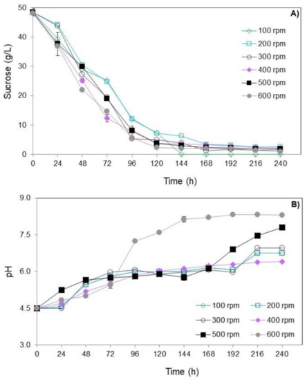 In the first set of experiments, the effects of the stirring speed from 100 to 600 rpm were evaluated. Next, pH-shift experiments were carried out at 500 rpm, adjusting the pH to 8.0 with NaOH (1 M) after the sucrose depletion (96 h of cultivation).