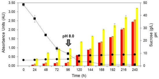 Figure 3. Production of yellow (yellow bars), orange (orange bars), and red colorants (red bars), pH (circle) and sucrose (square) as a function of time (0 to 240 h) during the submerged culture of T. amestolkiae in a stirred-tank bioreactor at 2.0 vvm, 30 °C, and 500 rpm. The black arrow indicates the pH-shift from 4.5 to 8.0 at 96 h for the production step. The error bars represent 95% confidence levels for the measurements.