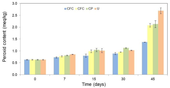 Figure 4. Peroxide content (PC, meq/kg) in the butter as a function of the packaging film used, such as: cassava starch-based films with colorant additives (CFC), cassava starch-based films without colorant additives (CF), conventional plastic (CP), and unpackaged butter (U), during different periods of time (0, 7, 15, 30, and 45 days) in storage. The error bars represent 95% confidence levels for the measurements.