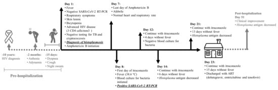 Messina, F.A.; Marin, E.; Caceres, D.H.; Romero, M.; Depardo, R.; Priarone, M.M.; Rey, L.; Vázquez, M.; Verweij, P.E.; Chiller, T.M.; et al. Coronavirus Disease 2019 (COVID-19) in a Patient with Disseminated Histoplasmosis and HIV—A Case Report from Argentina and Literature Review. J. Fungi 2020, 6, 275. https://doi.org/10.3390/jof6040275