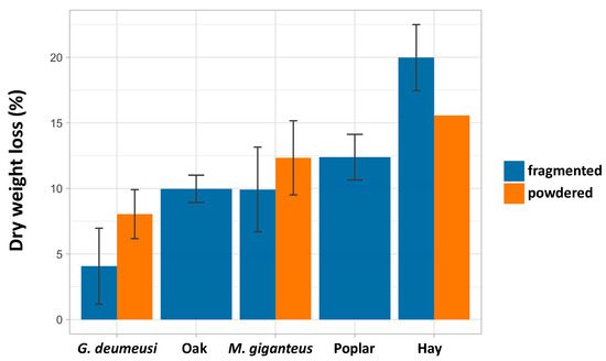 Dry weight loss in percent when P. anserina is grown on the indicated biomasses. The experiments are the combination of at least three assays, except for the powdered hay, which was assayed once.
