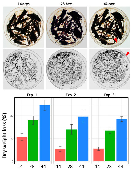 Dry weight loss of miscanthus after serial incubations. Top, scheme of the experiment. Middle, typical Petri plates after the first (14 days), second (28 days) and third (44 days) incubation. Perithecia are not easily visible owing to the darkening of the biomass triggered by drying. However, increased production of ascospores is easily visualized on the cover of the Petri plates. Red arrowheads point towards additional ascospores produced during the third incubation. Bottom, results of three independent experiments (in red, green and blue, each with 5 incubation plates) yielded the same outcome, with final loss ranging from 18% (Exp. 3) to 24.5% (Exp. 1).